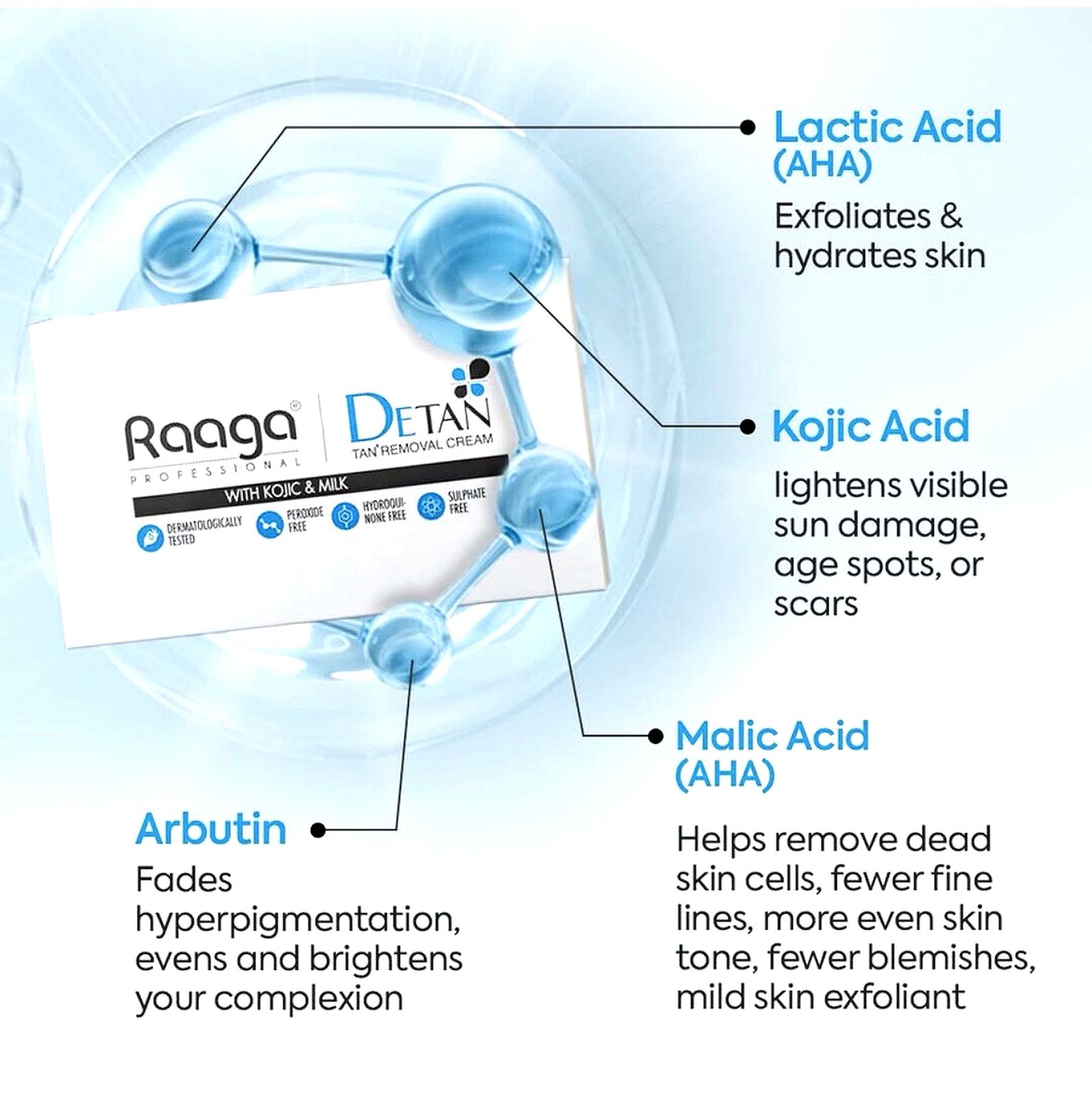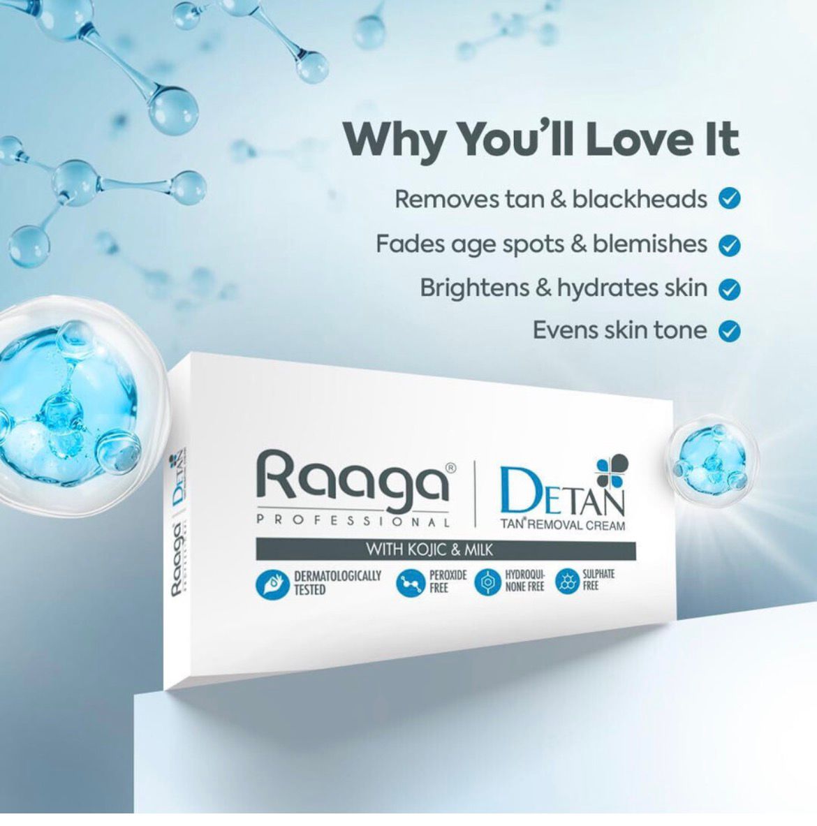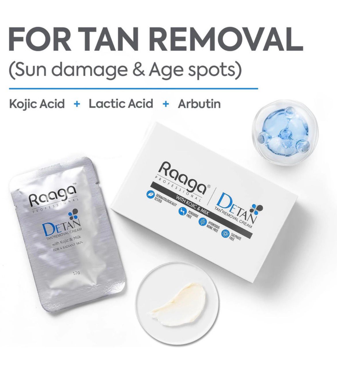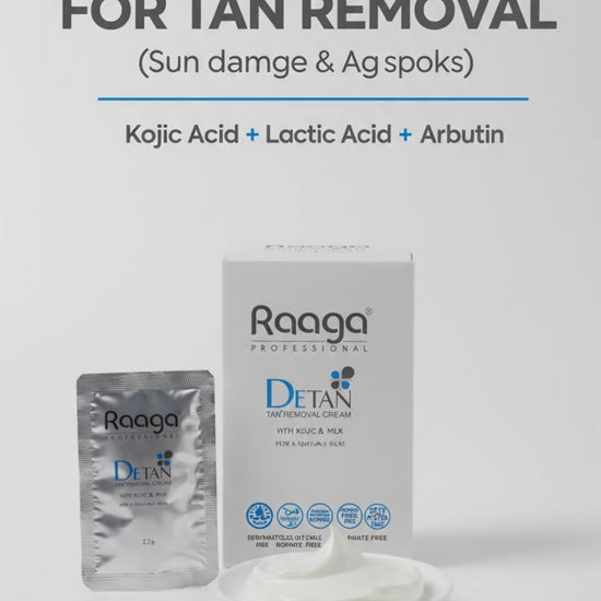 Unveil your skin's natural radiance with Raaga Professional De-Tan Cream enriched with the goodness of Kojic and Milk. Each sachet holds 12g of pure indulgence, totaling 72g of luxurious skincare goodness. Banish unwanted tans and embrace a brighter, more even complexion effortlessly. Let Kojic Acid gently exfoliate, while Milk nourishes and hydrates, leaving your skin feeling silky-smooth and glowing with renewed vitality. Experience the transformation as this cream works its magic, restoring your skin's youthful luminosity. Embrace the beauty of radiant, de-tanned skin with Raaga Professional De-Tan Cream. It is ammonia free. De Tan helps in removing epidermal suntan, while restoring the natural fairness of the skin. It is suitbale for all skin tyes and is dermatologically tested. The Kojic acid present in the formulation helps inhibit melanin formation and lightens the skin tone. Milk and Honey present as key ingredients in the formulation helps with the moisturization? and hydration of the skin.